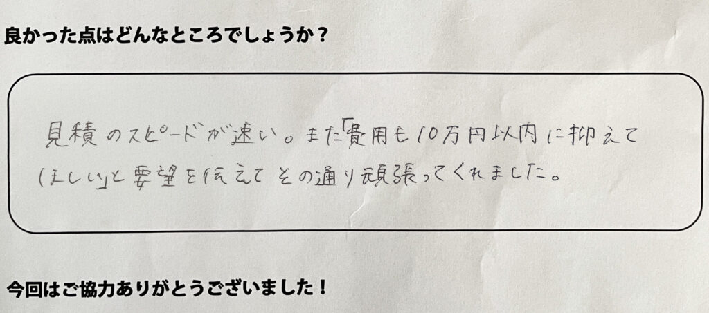 見積のスピードが速い。また費用も10万円以内に抑えてほしいと要望を伝えてその通り頑張ってくれました。